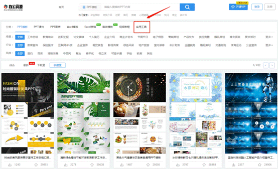 第一步:在电脑百度上,输入、搜索网站名称。输入、搜索后,点击、进入网站首页。在这里,我们可以看到有许多精美的素材资源模板。点击首页【分类】菜单栏中的【实用工具】,进入【实用工具】操作页面。