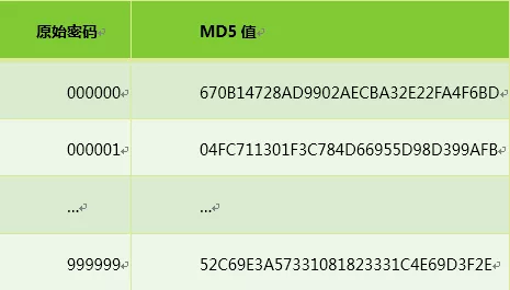 单向HASH算法由于不能进行解密运算,只能通过建表、查表的方式进行碰撞,即将常用的密码及其对应的HASH值全计算出来并存储,当获取到HASH值是,直接查表获取原始密码,假设用MD5算法来保护6位数字密码,可以建如下表: