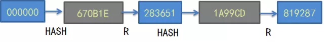 先对原始数据“000000”进行一次HASH运算得到“670B1E”,再对HASH值进行一次R运算,R是一个定制的算法可以将HASH值映射到明文空间上(这里我们的明文空间是000000~999999),R运算后得到“283651”,再对“283651”进行hash运算得到“1A99CD”,然后在进行R运算得到“819287”,如此重复多次,得到一条哈希链。然后再选用其它原始数据建立多条哈希链。最终仅将链头和链尾保存下来,中间节点全都去掉。