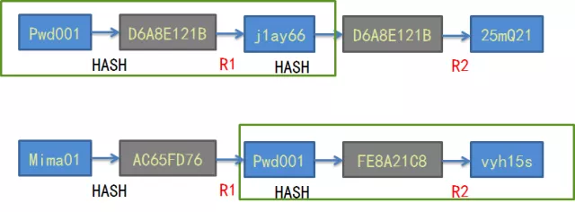 这样我们就可以基本确认“670B1E”对应的明文就在这条链上,然后我们把这条链的生成过程进行重新计算,计算过程中可以发现“000000”的HASH值就是“670B1E”,这样就完成了整个查表过程。这种表就是“预计算哈希链”。这种方式存在一个问题,多条链之间可能存在大量的重复数据,如下图所示: