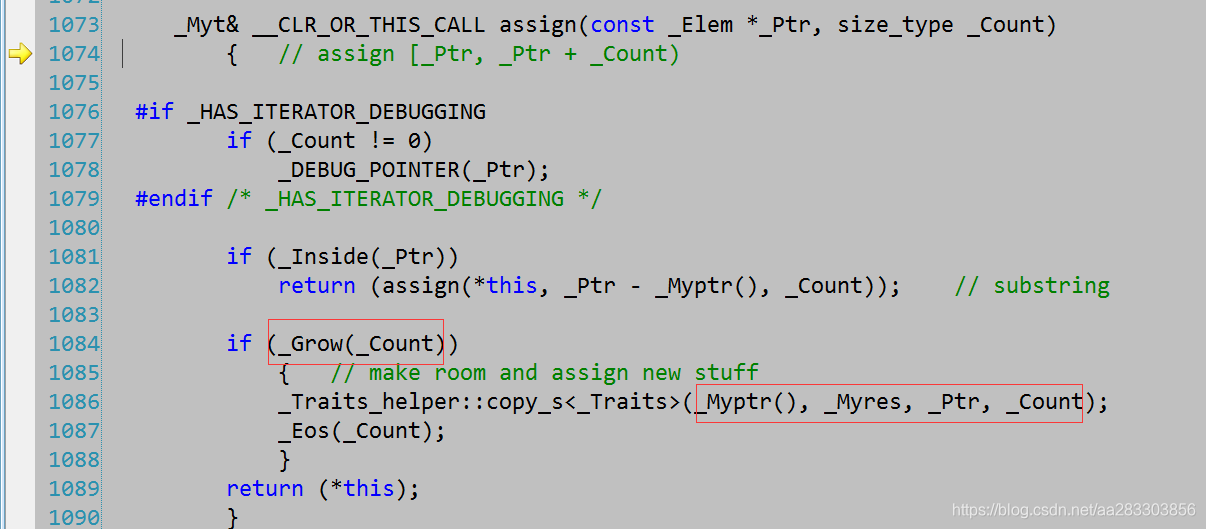 这里调用了STL的assign方法,初始构造容量肯定是0,因此需要增加3个字节的空间,调用 _Grow方法