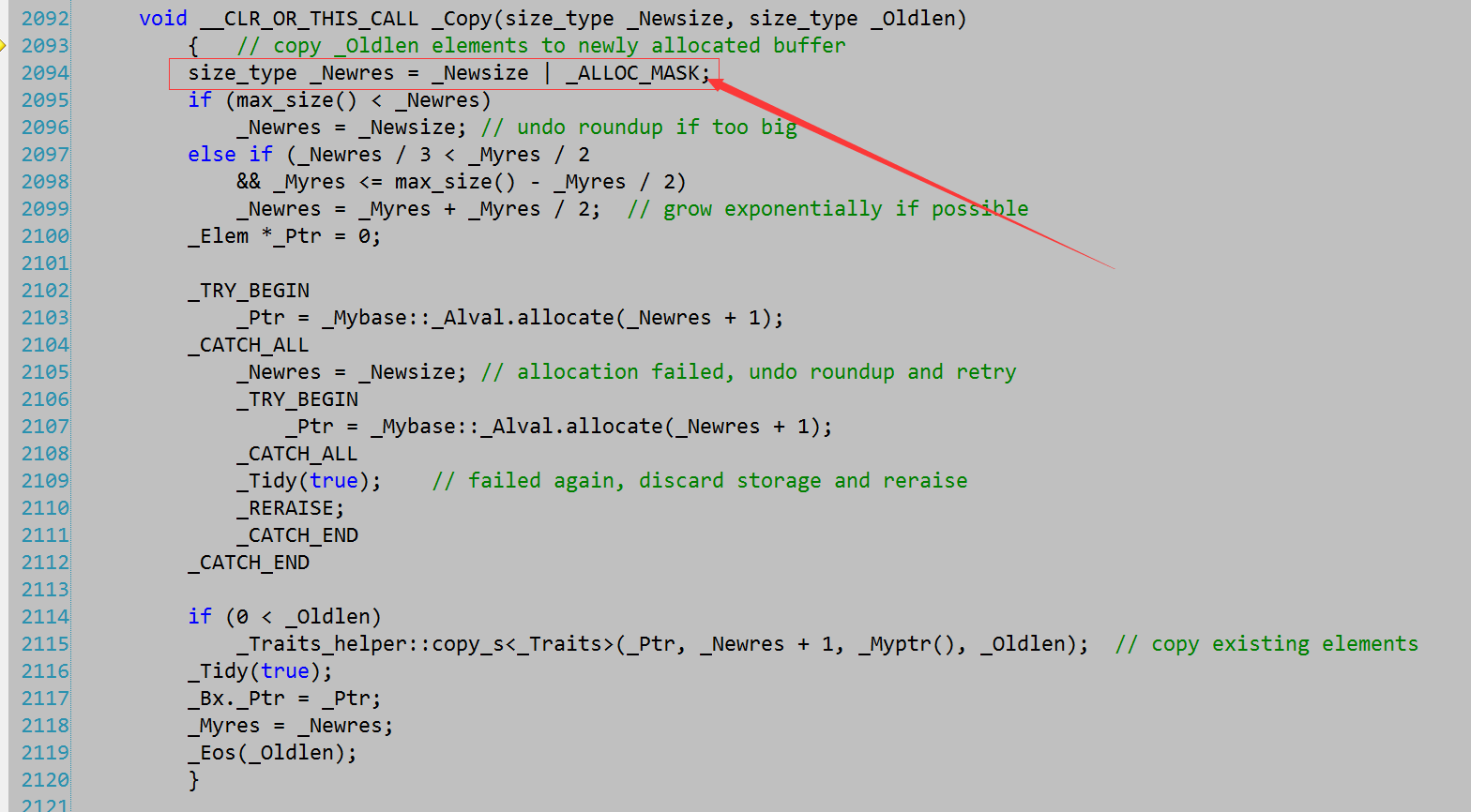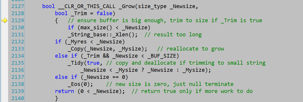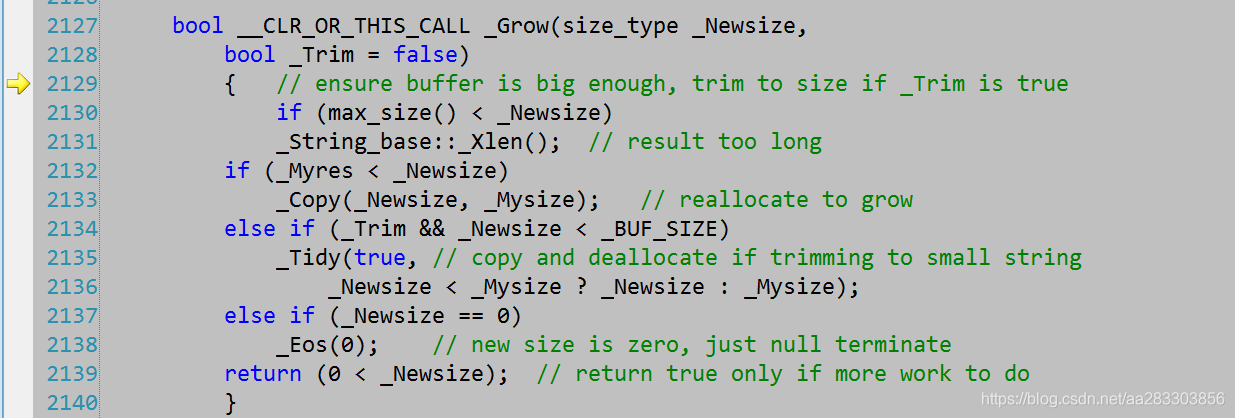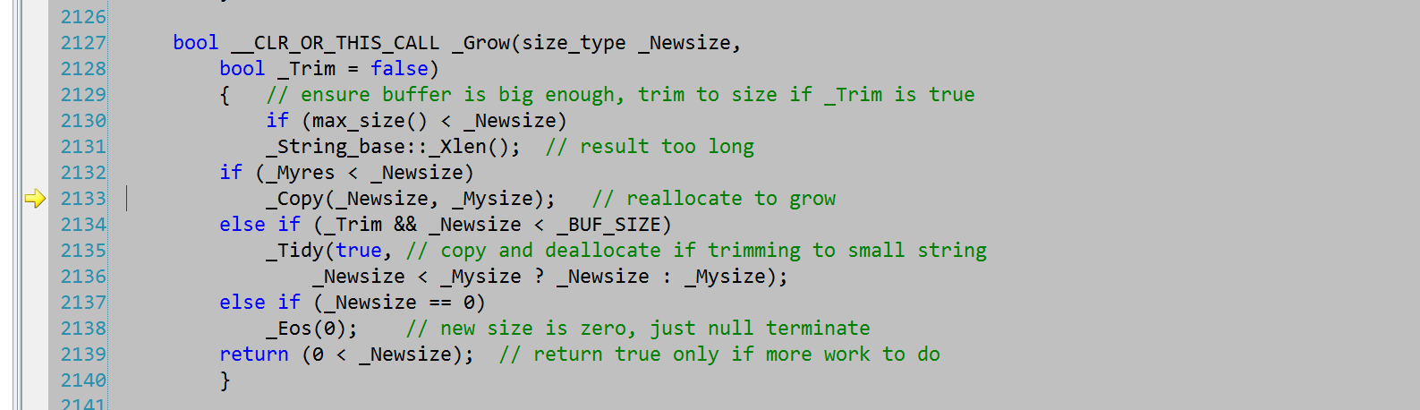 同样的流程,这一直跳到 _Grow方法,出现了不同,此时【_Myres < _Newsize】条件满足,开始执行_Copy方法