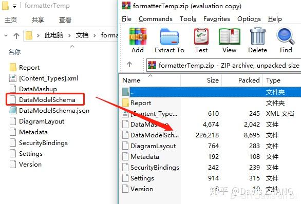 还有很多其他计算列和度量值存在不同的表,此处不一一列举。现在关闭PBIX文件(推荐另存为PBIT格式,此处另存为PBIT命名为formatterTemp),修改文件的后缀为ZIP,解压文件,你会看到一个名为DataModelSchema的文件,我们的所有DAX以及M代码等等都在此文件中定义,因此工具的任务是通过程序修改该文件以达到一次性格式化目的。现在,右键复制该文件的路径:
