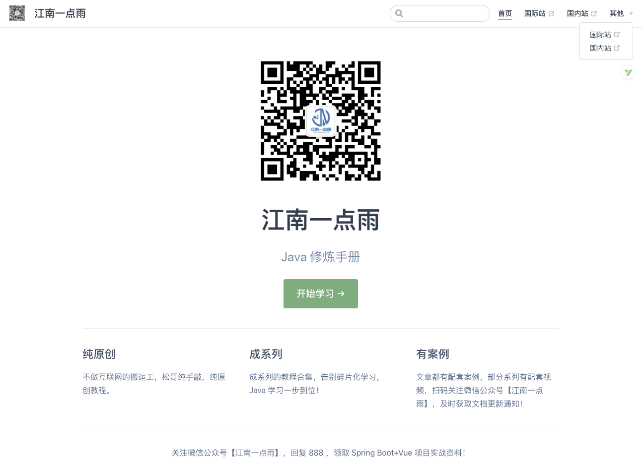 一个就是大家看到的 www.javaboy.org,这个网站是基于 GitHub Pages 做的,使用的技术栈是 hexo+icarus,公众号上的所有文章我都会同步到这个网站上去。