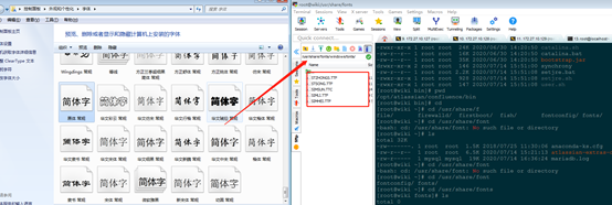 这里上传windows下的字体也是可以的,上传 C:\Windows\Fonts 目录下的文件到linux节点的目录 /usr/share/fonts/windowsfonts 下。(也可以直接上传目录,然后修改目录名即可)