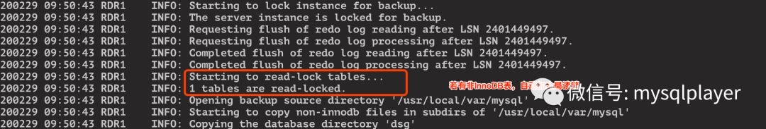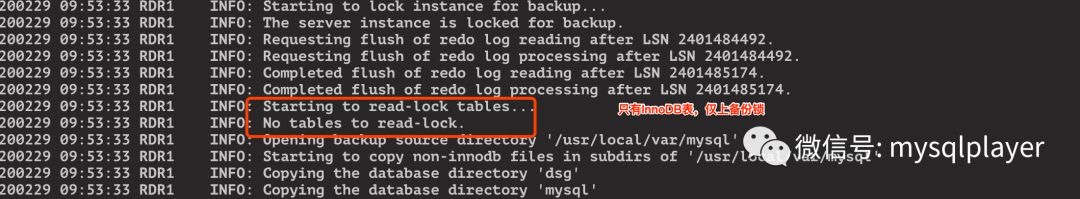 MySQL 8.0 支持轻量级备份锁 LOCK INSTANCE FOR BACKUP,数据字典也重构了由 InnoDB 存储。若不创建非 InnoDB 表,MEB 默认使用备份锁获取 binlog 日志一致性位置,并阻止 DDL 操作,但不影响 DML 操作。