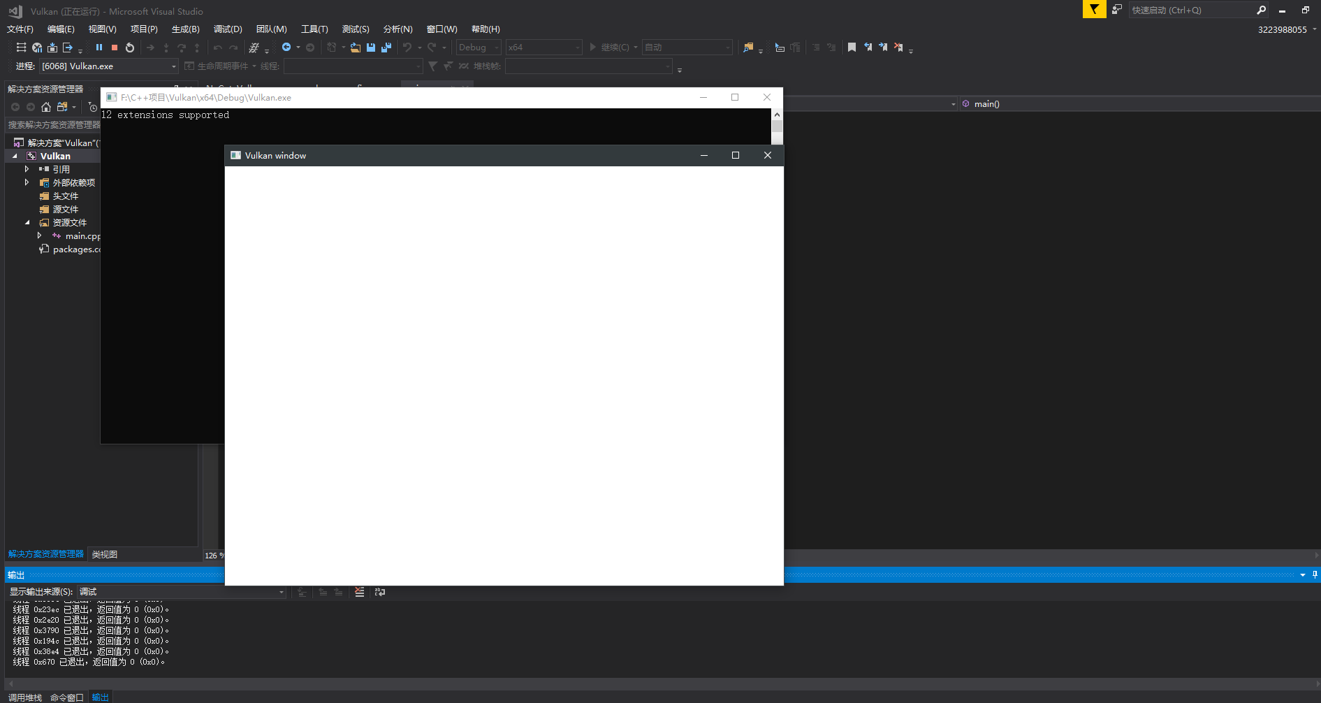 这个白窗口就是Vulkan的窗口了。至于黑窗口那里打印的“12 extension supported”,则是指有12个额外扩展可用。