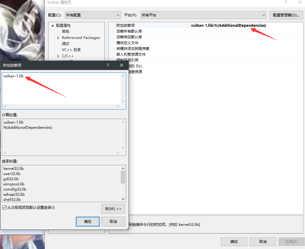 1.点“链接”–>“输入”–>“附加依赖项”,添加vulkan-1.lib,如下图 :