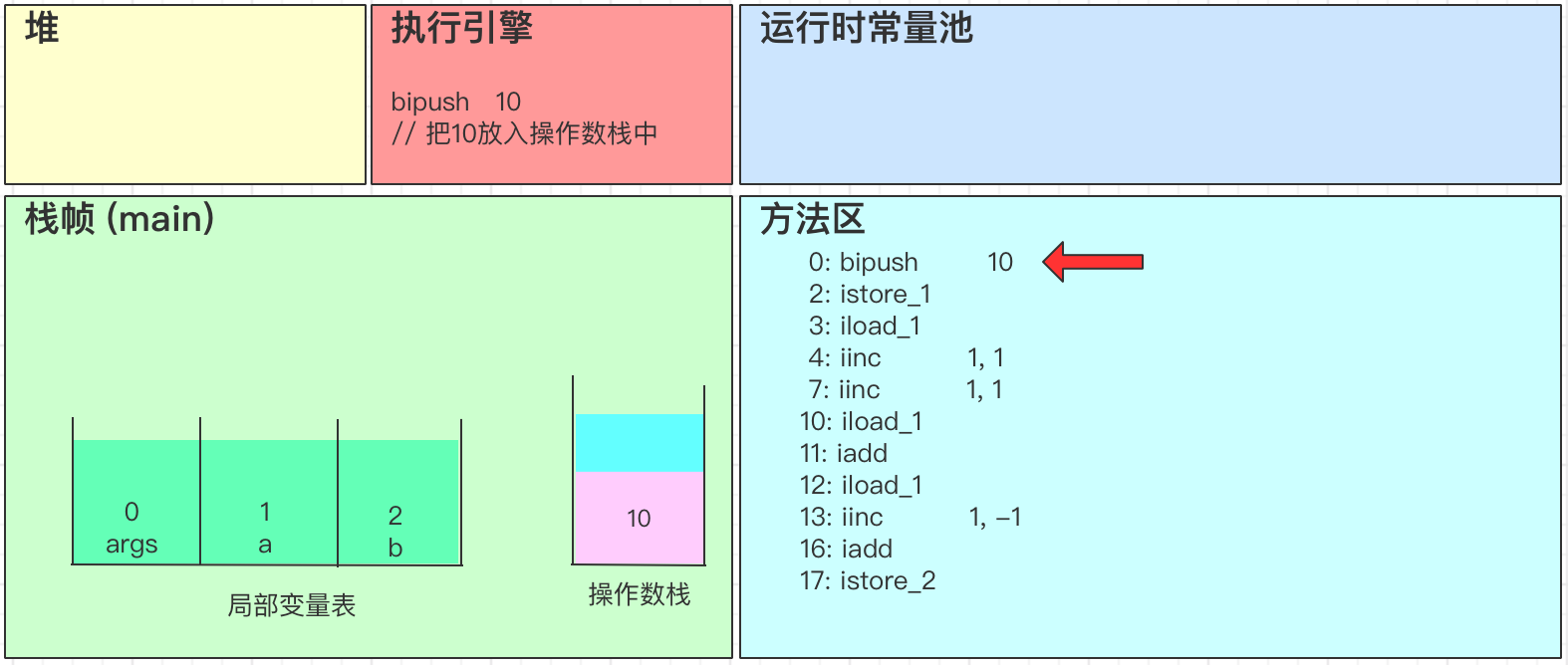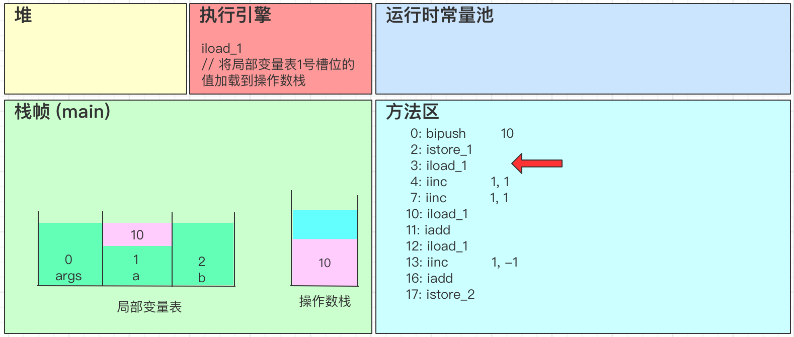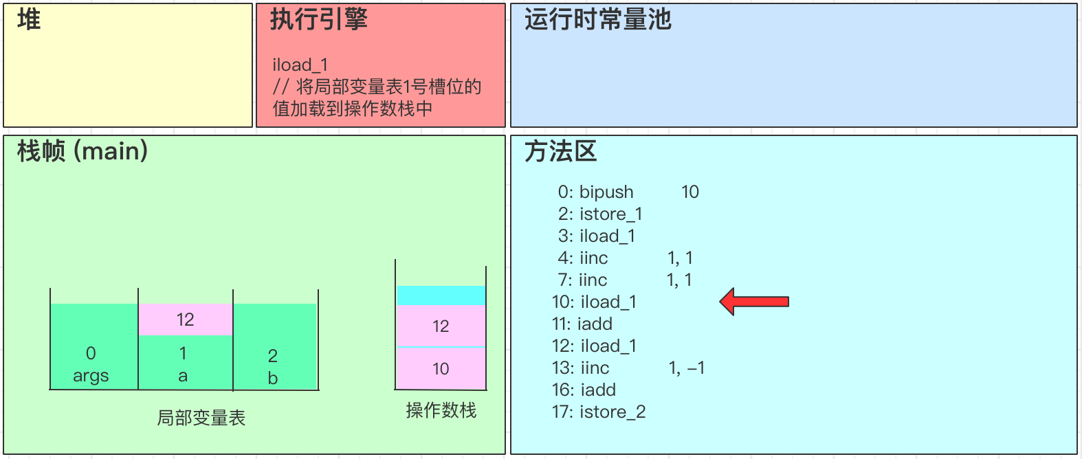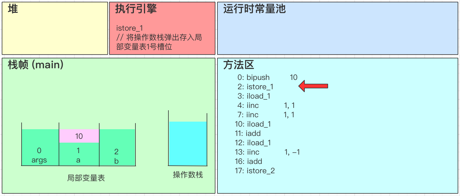 接着将10从操作数栈上弹出存入局部变量表1号槽位,相当于代码 int a = 10 执行完成