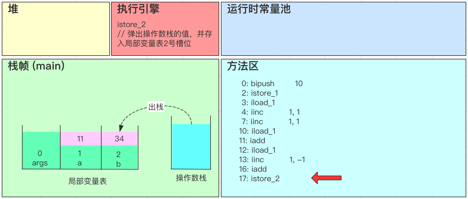 最后,执行istore_2操作,将操作数栈弹出数据34,并压入局部变量表2号槽位中