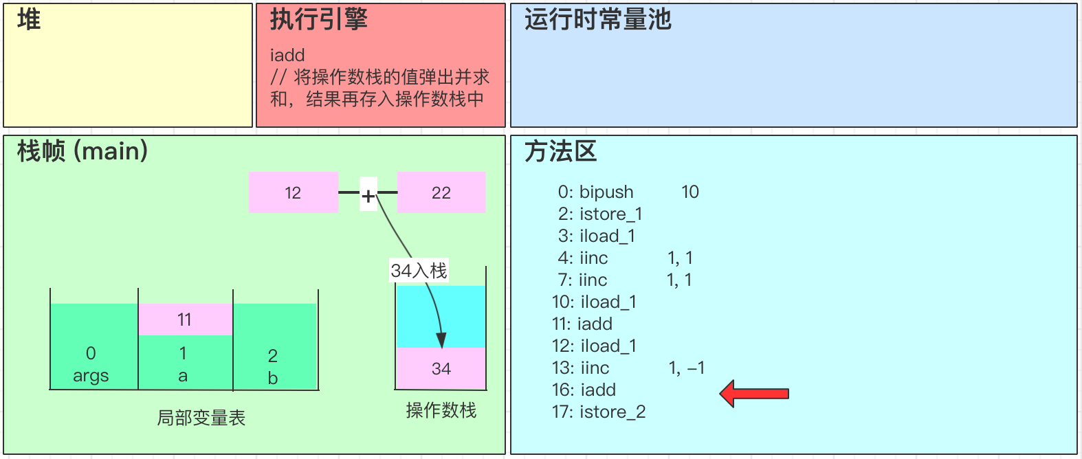 接着,执行iadd操作,将操作数栈12、22弹出栈后,进行求和操作得到34,再将34结果压入栈