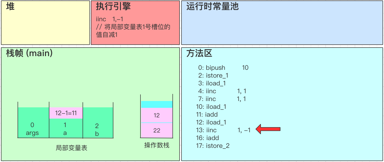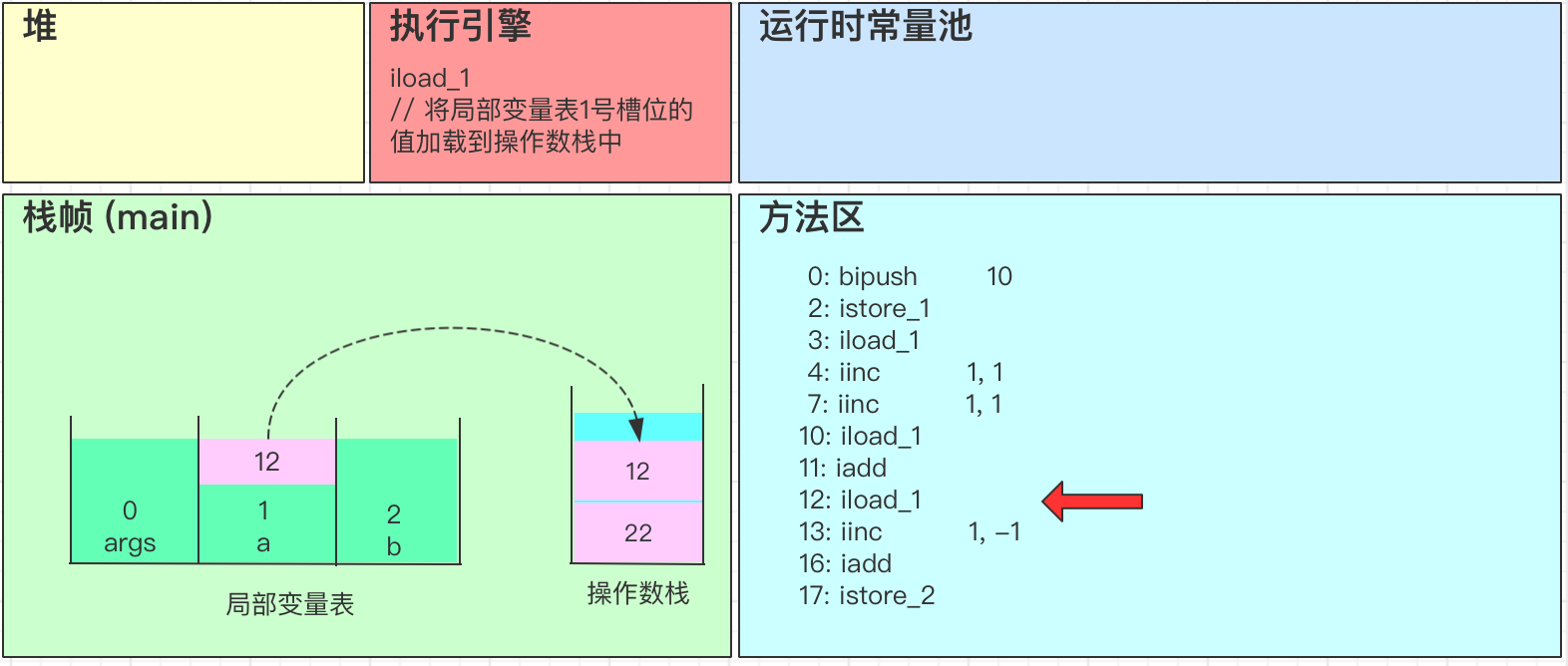接着,需要执行a--,先将局部变量表槽位1的数据12加载到操作数栈中