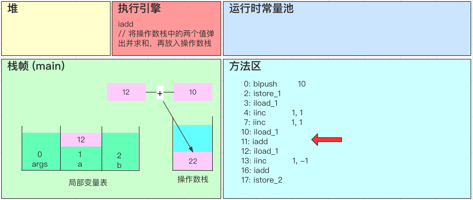 然后,iadd是将操作数栈中弹出(出栈)两个数12、10进行求和操作,得到22,最后将累加的结果22存入栈中。即完成了a++ + +aa的执行