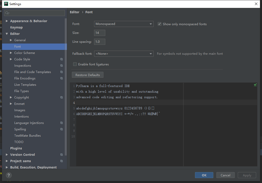先找到“editor”选项,然后点击“font”,这个是设置代码字体大小的地方。