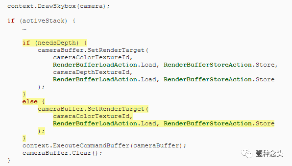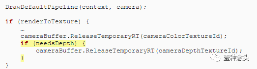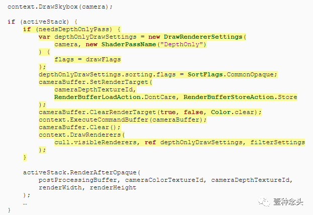 如果需要,在调用RenderAfterOpaque之前添加Depth-Only通道。就像不透明的通道一样,除了我们使用DepthOnly作为通道名称,不需要渲染器配置,并且必须设置和清除深度纹理作为渲染目标。