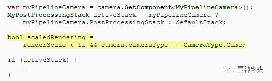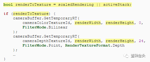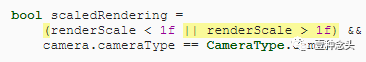 在“渲染”(Render)中渲染摄影机时,请确定在创建渲染纹理之前是否使用缩放渲染,以防出现活动堆栈。缩小渲染比例后,我们将使用缩放渲染,但是仅对游戏窗口摄影机使用,因此场景,预览和其他摄影机不会受到影响。使用布尔变量跟踪此决策,让我们可以参照。