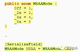 为MyPipelineAsset添加一个选项以选择MSAA模式。默认情况下,MSAA是关闭的,其他选项是2×,4×和8×,可以用枚举表示。枚举值表示每个像素的样本数量,因此默认值为1。
