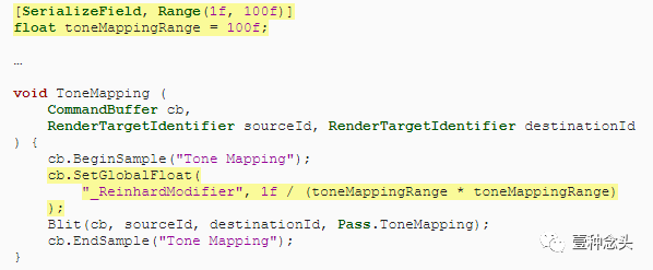 色调映射有多种方法-可以使用颜色分级对其进行进一步调整-但每通道RGB Reinhard最简单,因此我们先将其保留下来。但是我们可以进行的简单调整是通过调整压缩为LDR的值范围来限制效果的强度。超出此范围的任何东西都保持明亮。这样一来,我们就可以减少对亮度较弱的场景的调整,或者接受一些亮度过高的效果,以保持较暗的颜色不变。