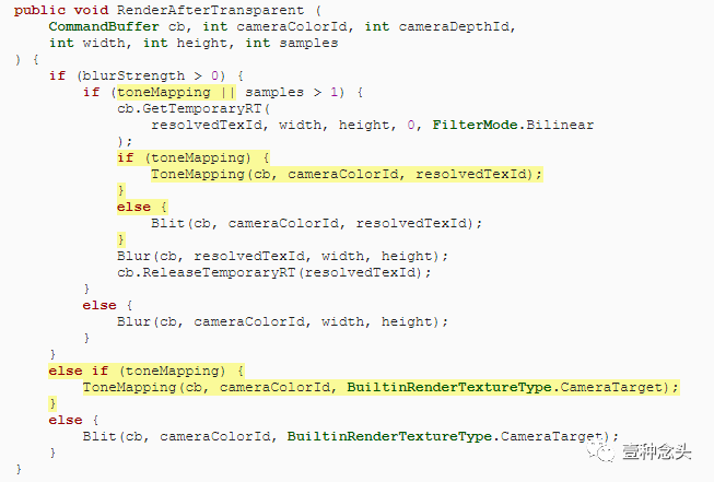 如果禁用了模糊,则在RenderAfterTransparent中,将色调映射到摄像机目标而不是常规blit。否则,当使用色调映射或MSAA时,通过适当的遍历创建解析的纹理。因此,在这种情况下解决可能意味着MSAA解决,色调映射解决或两者兼而有之。