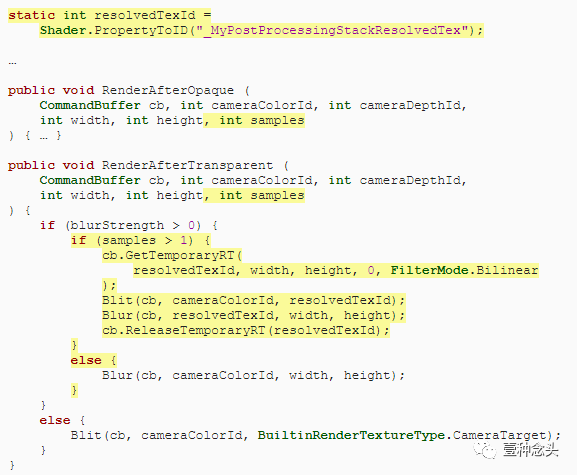 附加的解析通道没有用,因为我们的全屏效果无法从MSAA中受益。为了避免不必要地渲染到MS纹理,我们可以一次渲染到中间纹理,然后使用它代替相机目标。为此,可以在MyPostProcessingStack中的RenderAfterOpaque和RenderAfterTransparent方法中添加示例参数。如果启用了模糊并且使用了MSAA,则将其复制到已解析的纹理并将其传递给Blur。