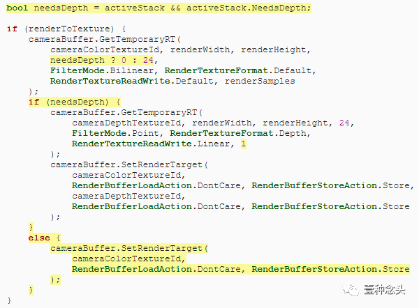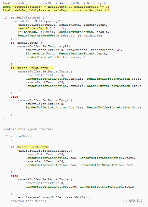 首先要区分是可以直接使用深度纹理还是因为MSAA处于活动状态而需要一个Depth-Only通道。我们现在拥有的获取纹理和设置渲染目标的逻辑适用于不使用MSAA的情况。