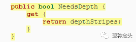 使效果再次起作用的幼稚方法是在启用深度条纹时不将MSAA应用于深度纹理。首先,向MyPostProcessingStack添加一个getter属性,该属性指示是否需要从深度纹理读取。仅在使用深度条纹效果时才需要。
