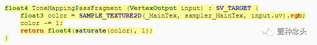 色调映射的目的是降低图像的亮度,以使均匀的白色区域显示各种颜色,从而揭示丢失的细节。就像你的眼睛不适应突然明亮的环境,直到再次看的清楚。但是我们不想均匀地缩小整个图像,因为那样会使深色变得难以区分,将高亮度换成曝光不足。因此,我们需要一个非线性转换,该转换不会减少很多暗值,但会减少很多高值。在极端情况下,零保持为零,并且接近无穷大的值减小为1。完成的函数为 c/(1 + c),其中c是颜色通道。该功能被称为Reinhard色调映射操作,最初由Mark Reinhard提出,只是他将其应用于亮度,而我们将其应用于各个颜色通道。使我们的色调映射通道使用它。
