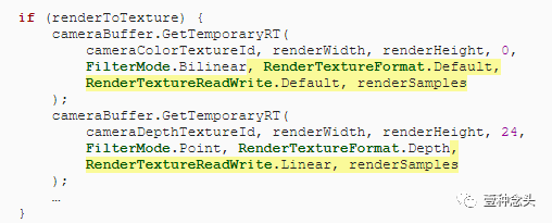 为了正确配置渲染纹理,我们必须在GetTemporaryRT中再添加两个参数。首先是读写模式,这是颜色缓冲区的默认模式,而对于深度缓冲区则是线性的。下一个参数是样本计数。