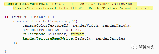 要存储超过1的颜色值,我们需要更改用于渲染纹理的纹理格式。如果我们的管道和摄像机都启用了HDR,则我们需要默认的HDR格式,否则我们可以使用常规默认值。区别在于HDR纹理的颜色通道包含浮点值而不是8位值。因此它们需要更多的内存,这意味着你仅应在需要时使用HDR。