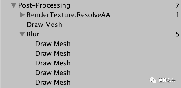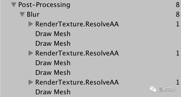 解析MS纹理会创建一个临时的常规纹理,该纹理在所有新纹理渲染到MS纹理之前一直有效。因此,如果我们多次采样然后渲染到MS纹理,则最终将获得相同纹理的额外解析通道。激活启用了模糊的后效果堆栈时,你会看到此信息。在强度为5的时候,我们获得了3个解析通道。
