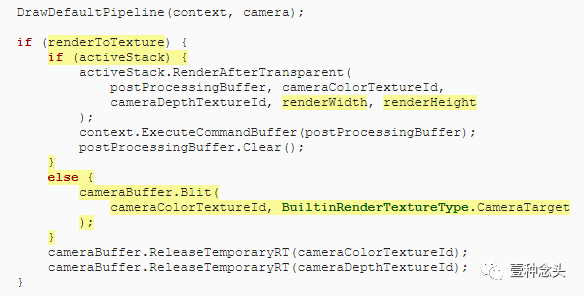 RenderAfterTransparent也是如此。现在,我们必须始终在渲染纹理时释放纹理,而仅在使用堆栈时才调用RenderAfterTransparent。如果不是,我们可以使用常规blit将缩放后的纹理复制到相机的目标。