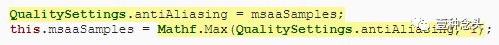 并非所有平台都支持MSAA,最大样本数也有所不同。超过最大值可能会导致崩溃,因此我们必须确保保持在限制之内。我们可以通过将样本计数分配给QualitySettings.antiAliasing来实现。我们的管道不使用此质量设置,但在分配给它时会注意执行限制。在分配给它之后,我们将其复制回我们自己的样本计数。我们唯一需要知道的是,当不支持MSAA时,它会产生零,我们必须将其转换为样本计数1。