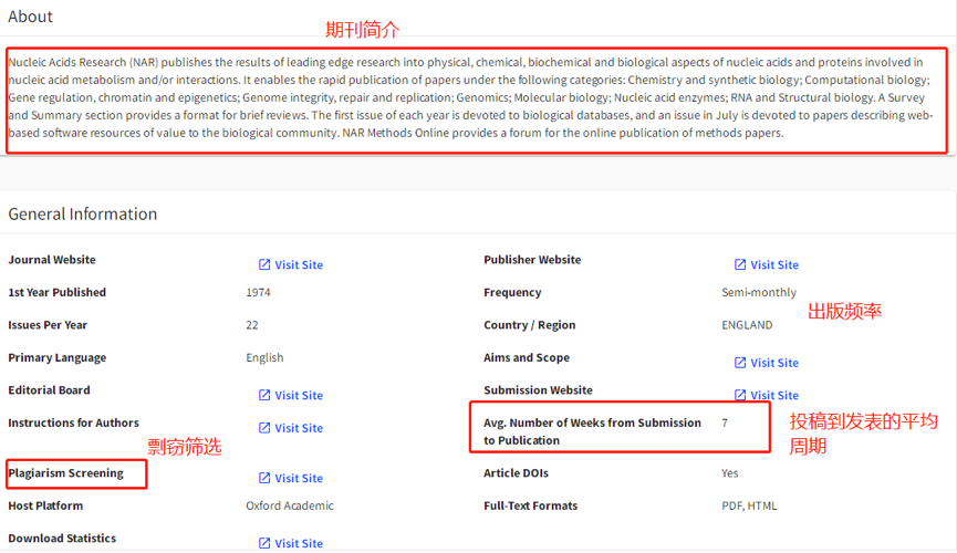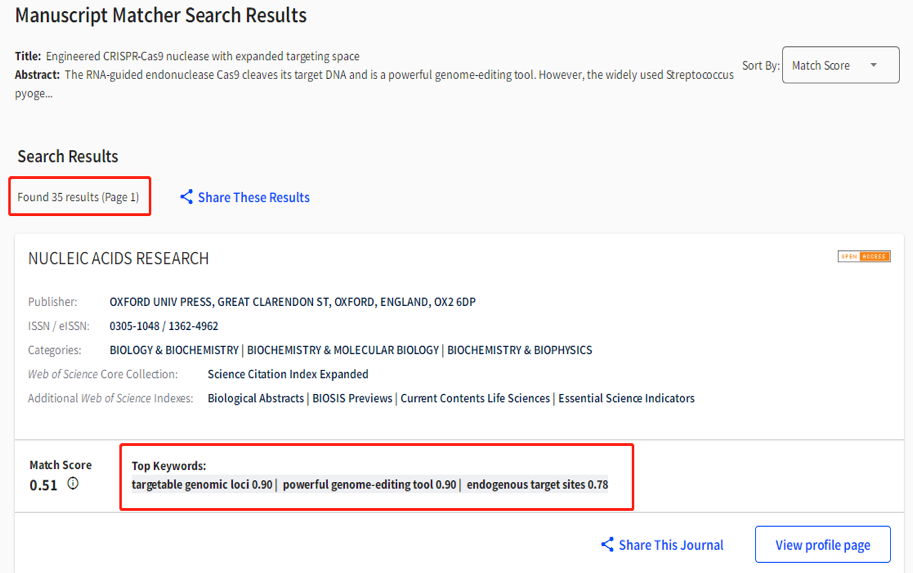 可以看到一共匹配出了35本合适的期刊,其中匹配度最高的是Nucleic acids research,除了在主界面可以大致看到这本期刊的介绍外,在右下角你可以点击【View profile page】非常详细地了解这本期刊的各项指标。