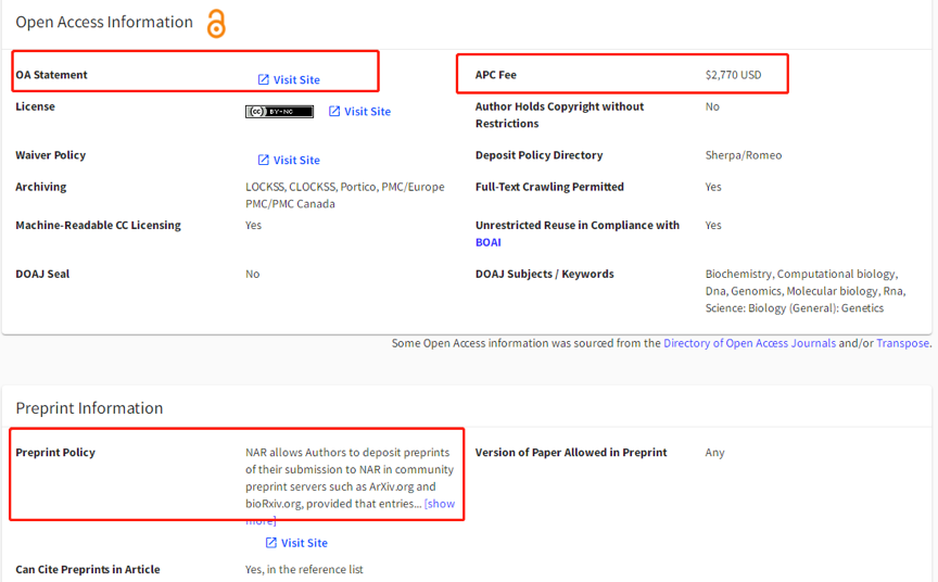 再接着往下拉,你还可以了解这本期刊是否open access,相关收费如何,以及是否允许在ArXiv.org和 bioRxiv.org这些预印的网站上先公开你的研究结果。