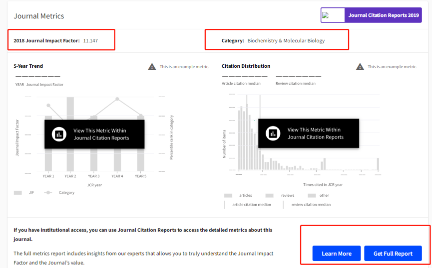 然后接着往下拉,你可以看到这本期刊的影响因子,点击下方的[get full report],你就可以获得Web of Science官方出品的所有影响因子的相关报道。