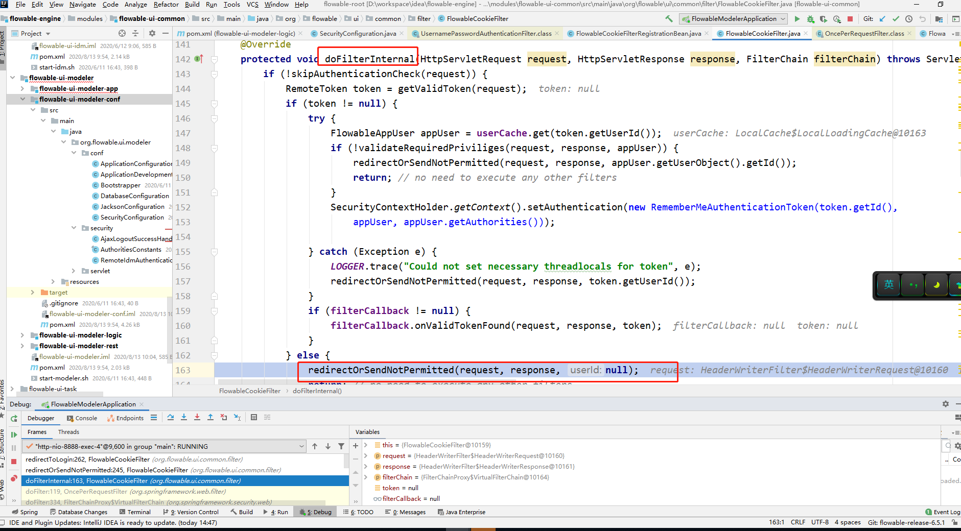 在 flowable-ui-modeler-conf 的 SecurityConfiguration 添加 filter ,对请求进行拦截