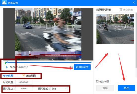 第三步:“截图设置”的窗口跳转出来后,拖动视频下方的绿色小三角符号到需要截图的地方,点击“截图到列表”,然后右侧会出现截图预览。视频下方还可见关于截图的一些信息,比如图片缩放比例、格式类型等(自行设置)。右侧下方还可以选择输出长图。以上参数都设置完了,最后点击“确定”。
