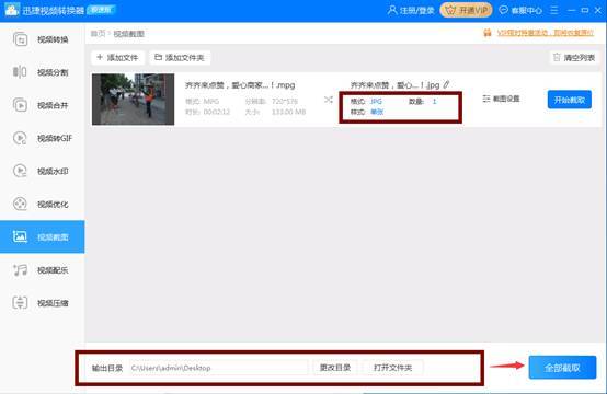 第四步:检查视频格式、截图数量等,然后修改输出目录,点击“全部截取”,截取完毕即可打开文件夹查看效果。