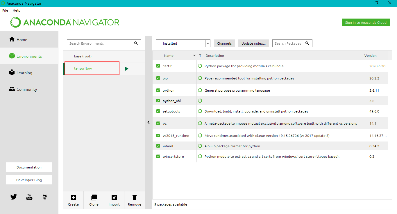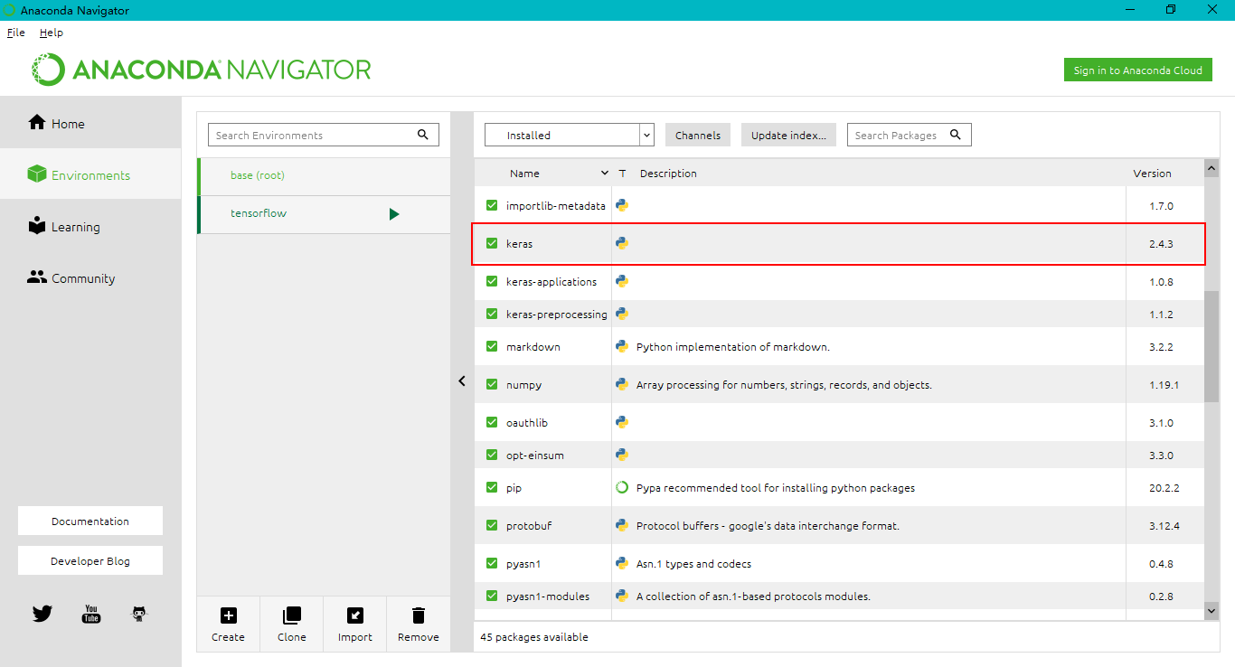 pip install keras -i https://pypi.doubanio.com/simple开始安装kares - Anaconda Navigator中显示如下即安装成功