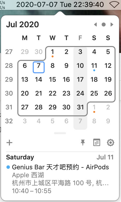 Mac 左上角的时间栏只能看当前时间不能看日历非常的不方便,因此有很多软件都支持左上角时间点击显示日历,但是 Itsycal 是我用过最方便轻量的免费软件, 不仅可以同步日历的事件,而且各种小功能也非常的实用: