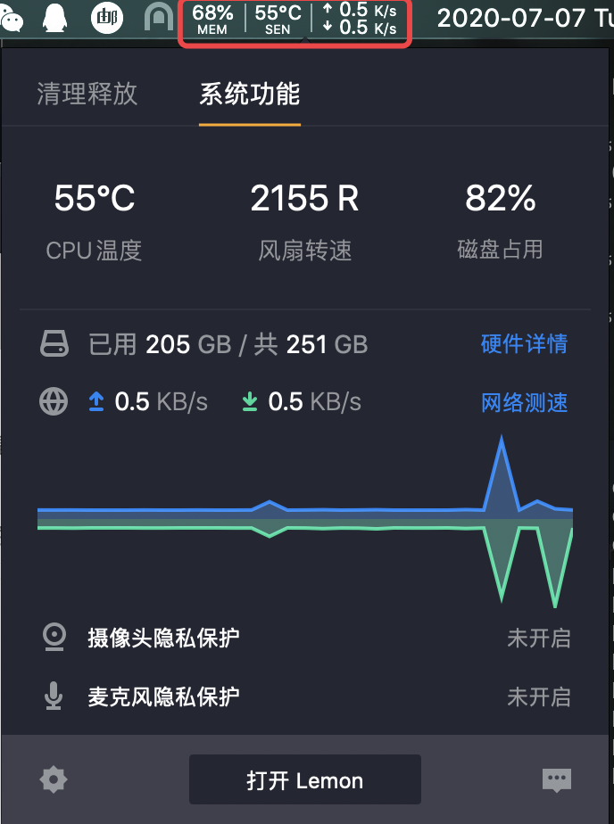 腾讯柠檬清理,基本对标的就是 CleanMyMac,我个人没用过 CleanMyMac,但是感觉腾讯家的这个产品挺好用,在内测的时候就在一直用,产品在社区里面也一直听取用户的意见改进,持状态栏显示当前内存占用、网速等,对我来说是够用了。