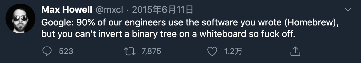 其中有个趣闻,就是 homebrew 作者因为不会白板翻转二叉树被 Google 拒了。笔者搜到 15 年的推特图。。。