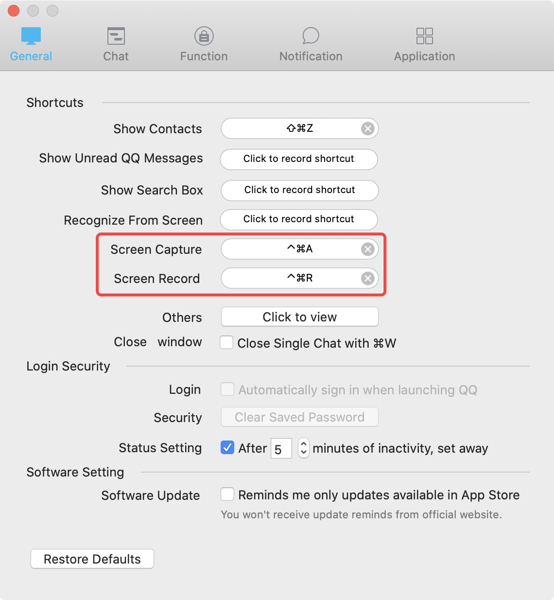 QQ 首选项配置截图、录制快捷键设置: