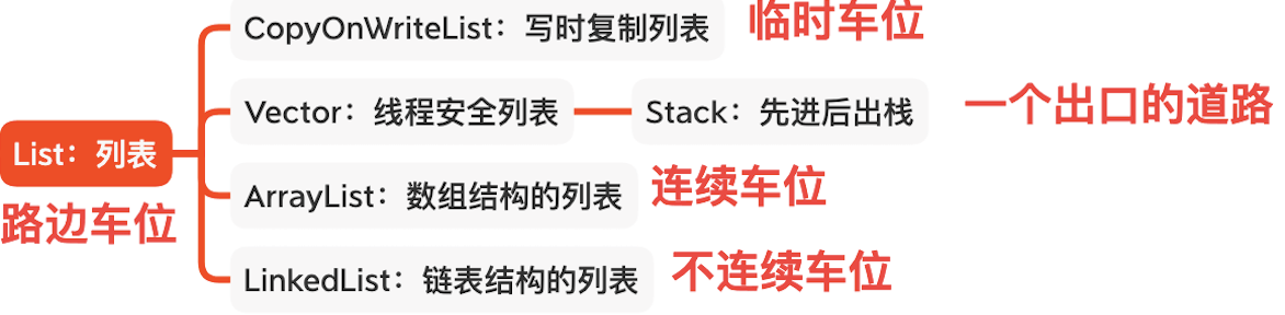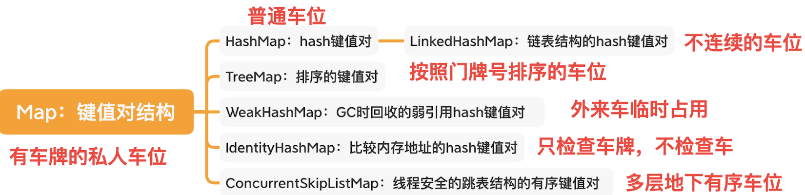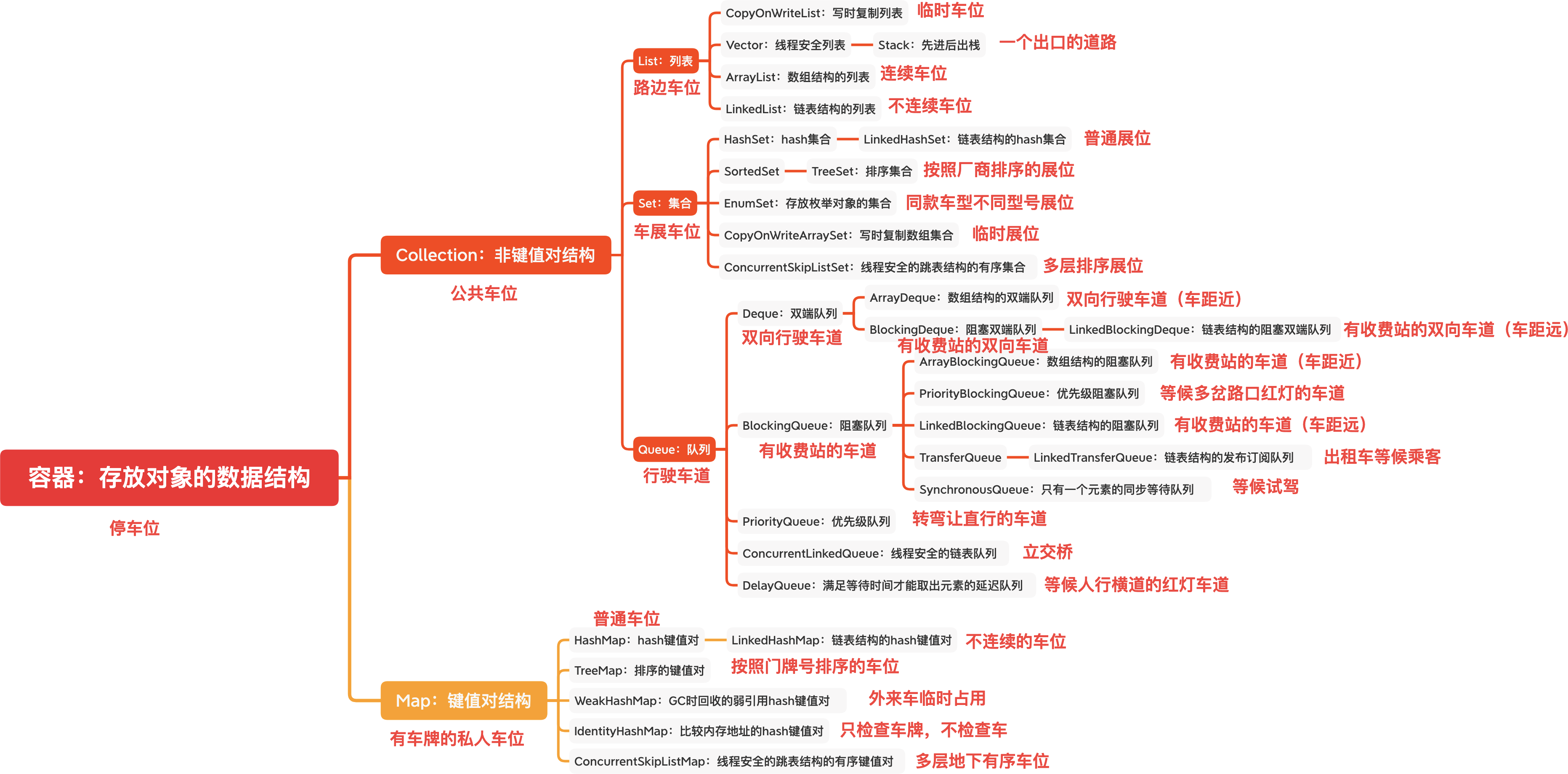 也许说到某一个具体类时,你可以说出些皮毛。但是,面对整体那么多类,你又能记住多少个呢?先看下面这张常用容器一览图,其中我又抽象出了生活场景中的车位。