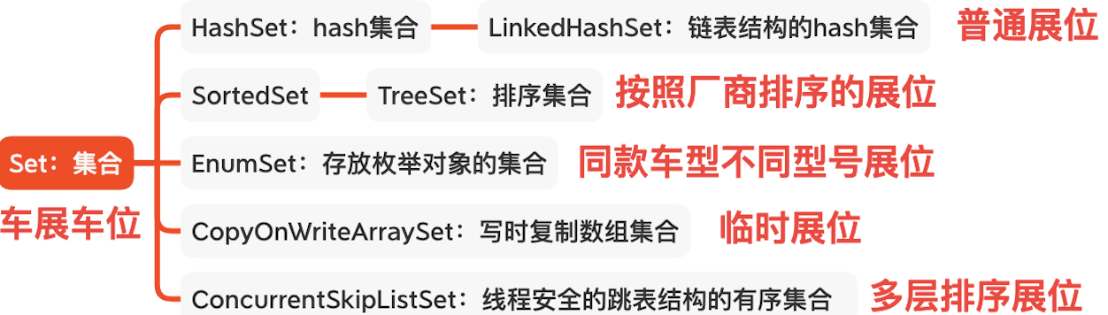 为什么使用车展表示Set呢?因为set的最大特性就是元素不重复,而车展上一般都是每个型号只有一辆车(忽略特殊情况)。