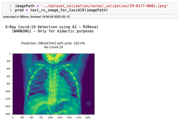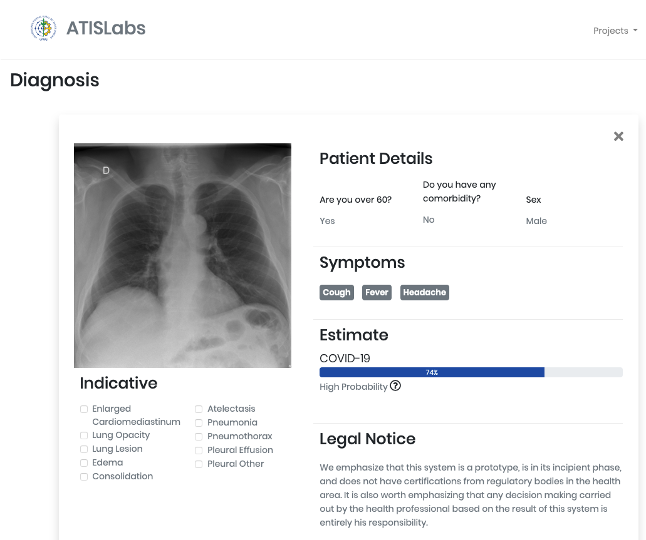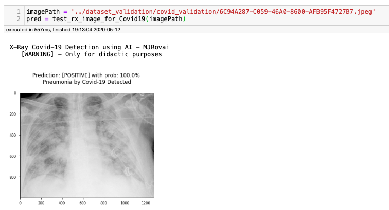 该项目的灵感来源于UFRRJ(里约热内卢联邦大学)开发的X光COVID-19项目。UFRRJ的XRayCovid-19是一个正在开发的项目,在诊断过程中使用人工智能辅助健康系统处理COVID-19。该工具的特点是易用、响应时间快和结果的有效性高,我希望将这些特点扩展到本教程第4部分开发的Web应用程序中。下面是诊断结果之一的打印屏幕(使用了Covid-19数据集1图像之一):