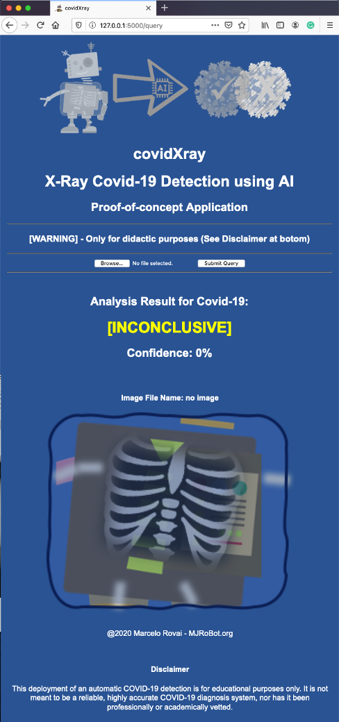 本研究是为X光图像中COVID-19的自动检测而开发的,完全是为了教育目的。由于COVID-19没有经过专业或学术评估,最终的应用并不打算成为一个准确的用于诊断人类的COVID-19的诊断系统,。