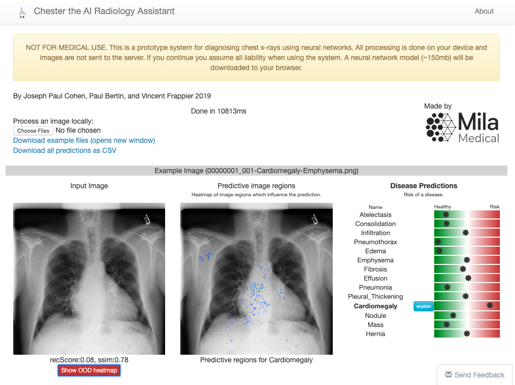 另一项工作是Chester,论文:https://arxiv.org/pdf/1901.11210.pdf,由蒙特利尔大学的研究人员开发。 Chester是一个免费且简单的原型,医疗专业人员可以使用它们来了解深度学习工具的实际情况,以帮助诊断胸部X光。 该系统被设计为第二意见,用户可在其中处理图像以确认或协助诊断。