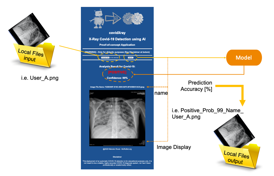 X光扫描胸部图像(User_A.png),应用程序将图像存储在web应用程序的计算机上,决定图像是否属于受病毒污染的人(模型预测:[阳性]或[阴性])。在这两种情况下,应用程序都会通知预测的准确性(模型准确度:X%)。