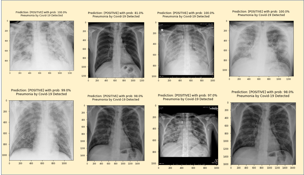 由于输入数据集也有正常患者(未经训练)的X光图像,让我们应用模型2(Covid/普通肺炎)看看结果如何